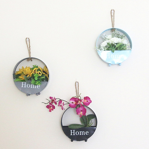 Adorno colgante de pared redondo de estaño de cuerda de cáñamo grueso, flor artificial, bonsái de flor rosa